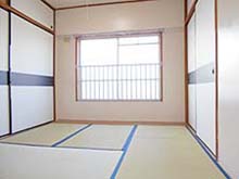 ![]() 洋室(フローリング6帖程度) 折りたたみベッド、食卓・椅子2脚、 カーテン(政策パック標準装備) ※2号棟4・5階は6帖和室となります。 |
